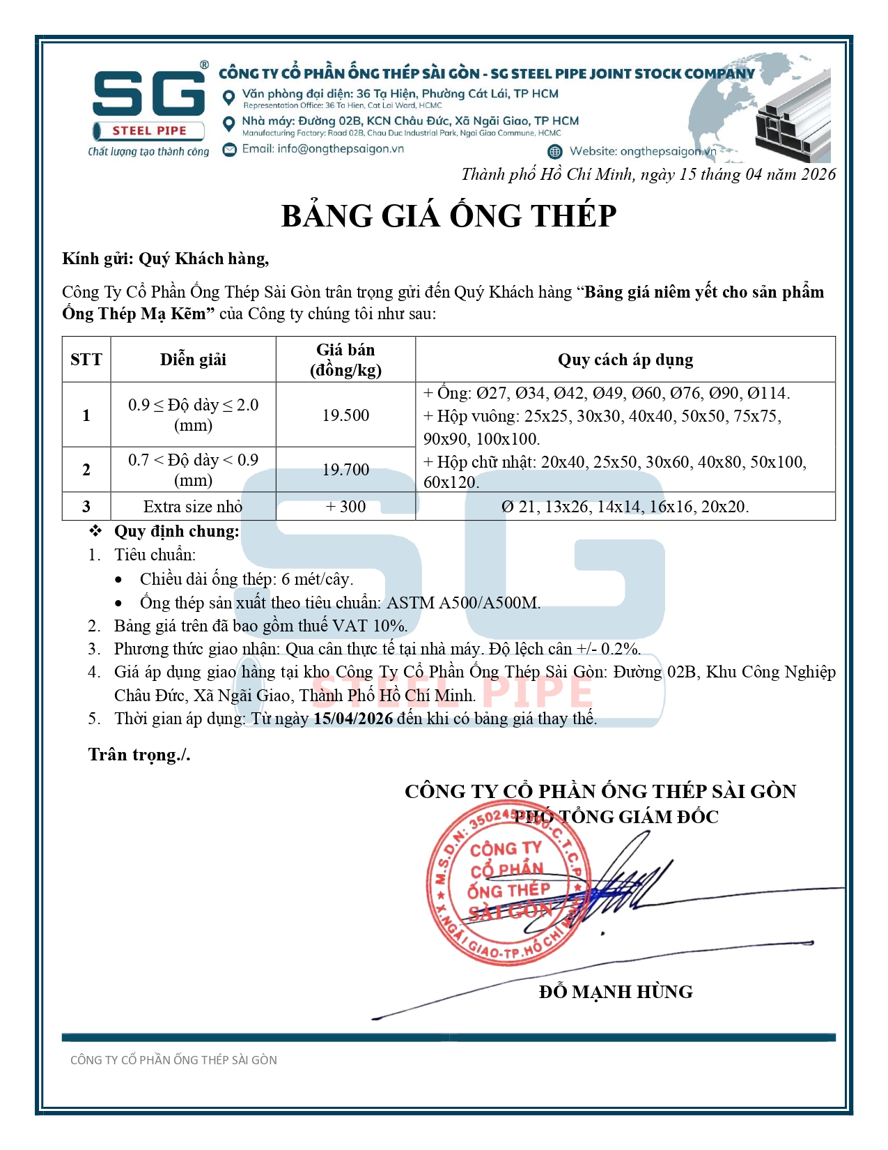 BẢNG NIÊM YẾT SẢN PHẨM ỐNG THÉP SÀI GÒN