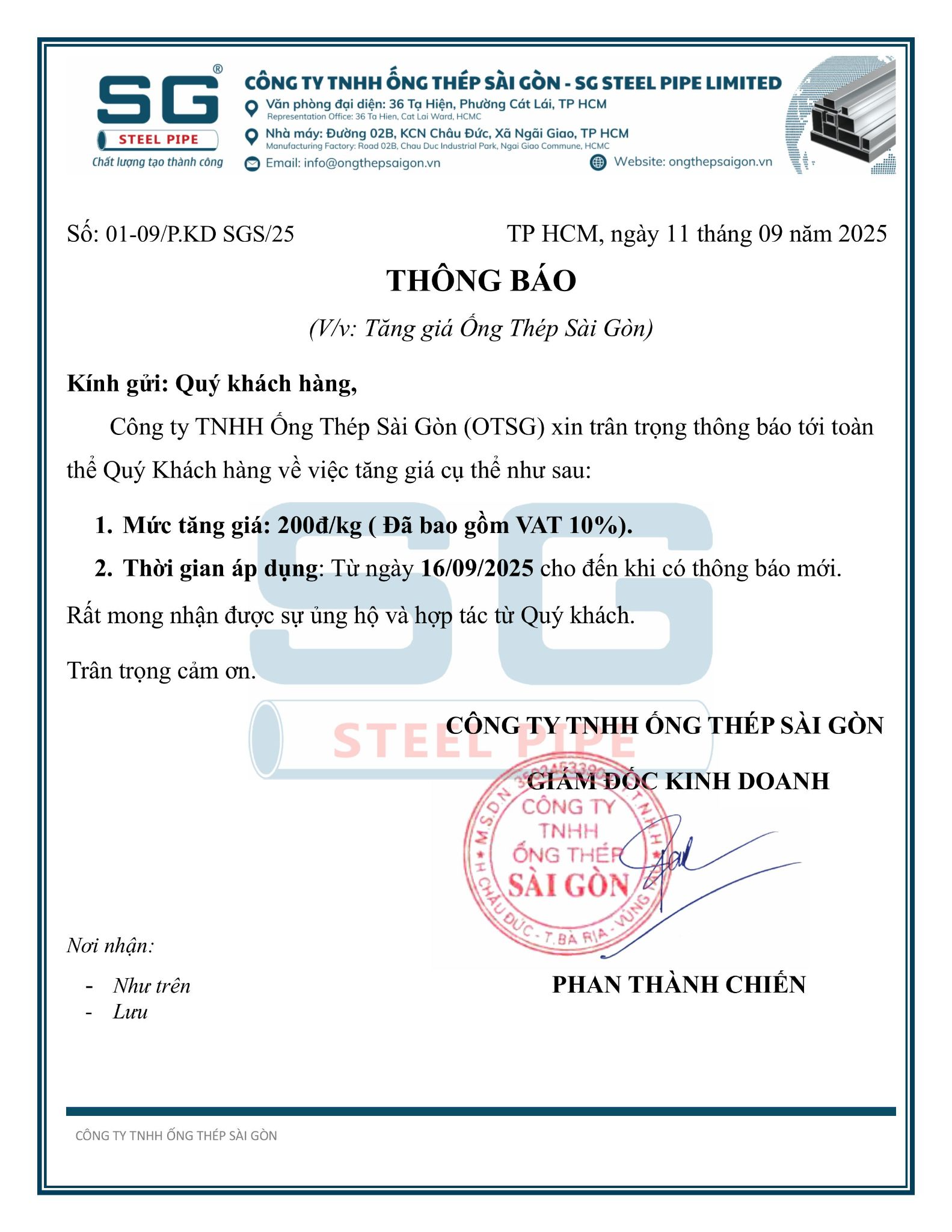 Công ty TNHH Ống Thép Sài Gòn (OTSG) xin trân trọng thông báo đến toàn thể Quý khách hàng về việc điều chỉnh giá bán sản phẩm thép, cụ thể như sau: