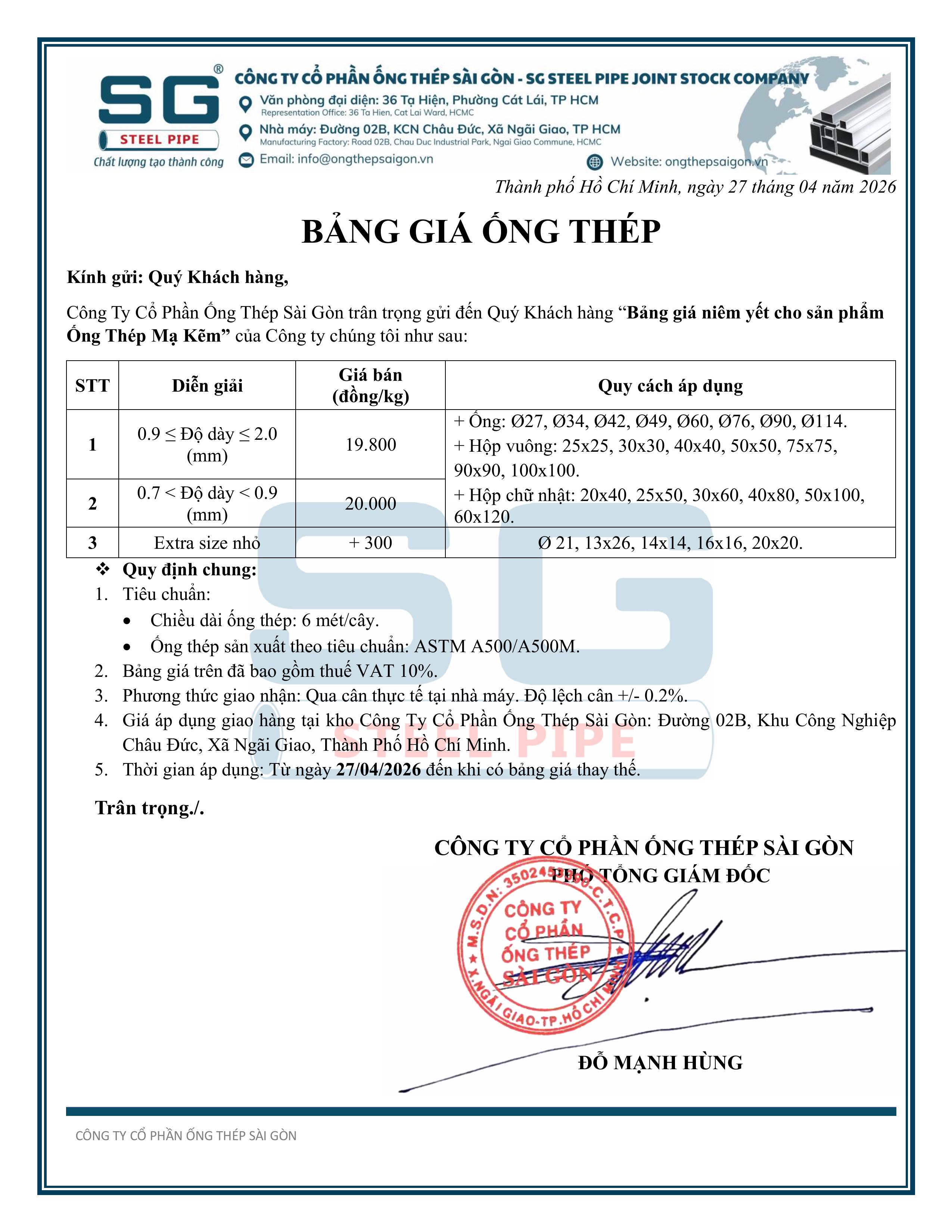 BẢNG NIÊM YẾT SẢN PHẨM ỐNG THÉP SÀI GÒN